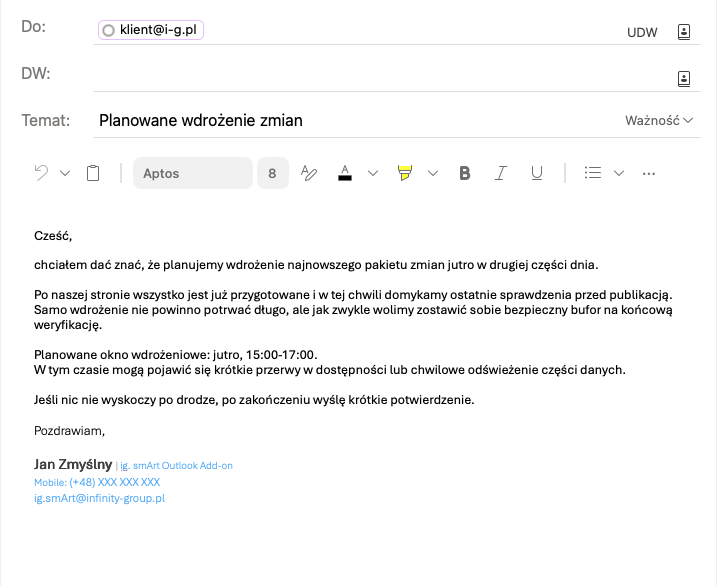 ig. Smart e-mail pomaga szybciej przygotować uporządkowane wiadomości, wyróżnić ważne informacje i zaproponować terminy spotkań bez ręcznego formatowania treści. Wszystko odbywa się bezpośrednio w panelu dodatku podczas pisania wiadomości.